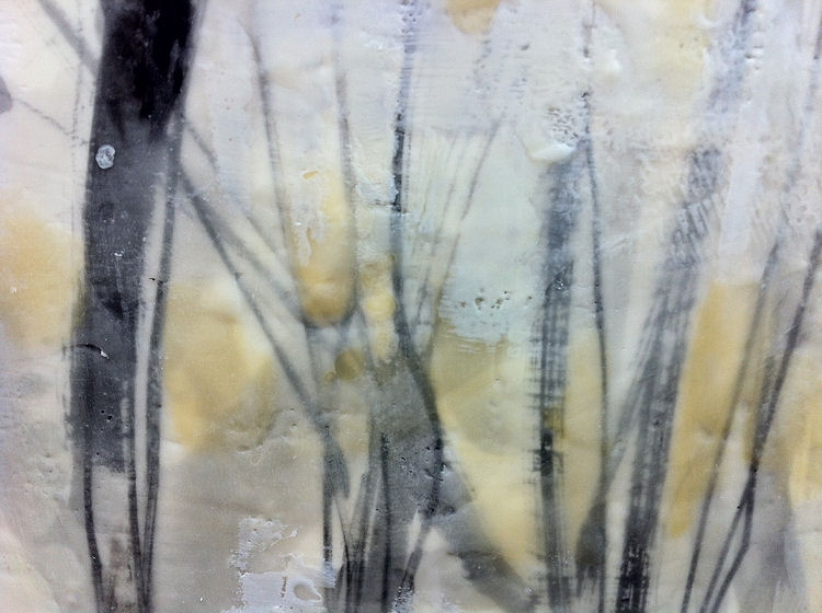 I just kept adding more encaustic wax paint and medium along with making marks with oil sticks………fusing and scraping. The color for this image is better than the previous iphone photos although when you see it on your monitor it could look different. I think the original is slightly warmer than the painting image. This may be due to reflected sky lighting.